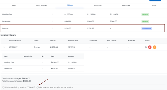 In Truckpedia's Load Charge V2 and Invoice V2 system, you can generate supplemental invoices for scenarios where additional charges (such as detention, layovers, or accessorials) were missed in the initial invoice. These are treated as separate invoice documents with distinct identifiers but are linked to the same load.
