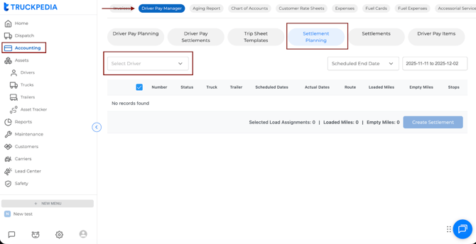 1. Go to Driver Pay Manager → Settlement Planning