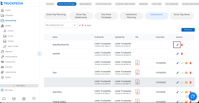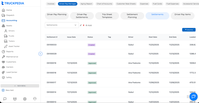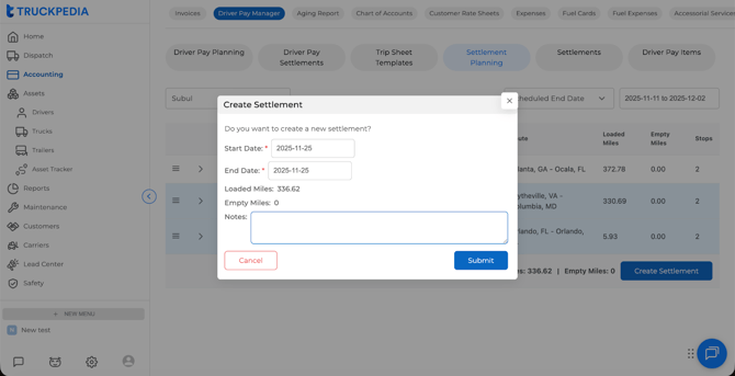 Once trips are dispatched, Truckpedia V3 allows you to generate a complete driver settlement based on the loads completed and the driver pay rules already assigned. The settlement shows all load assignments, miles, and automated pay calculations, and you can edit everything before final approval.