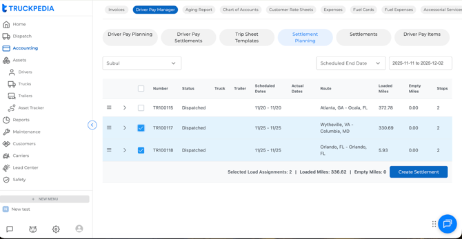 Every dispatched load is shown in a list. To include a load in the settlement: