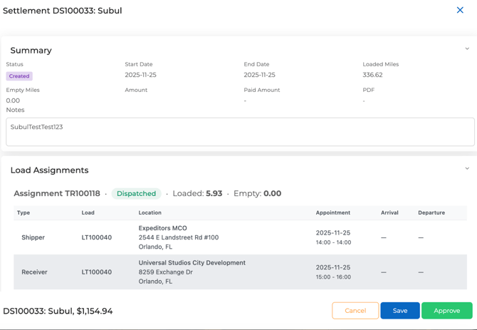 This article walks through the full flow from selecting loads → generating the settlement → reviewing → editing → approving.