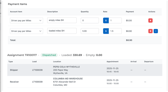 - Loaded miles SH → Quantity 5.93 → Rate $1.50 → Payment $8.90