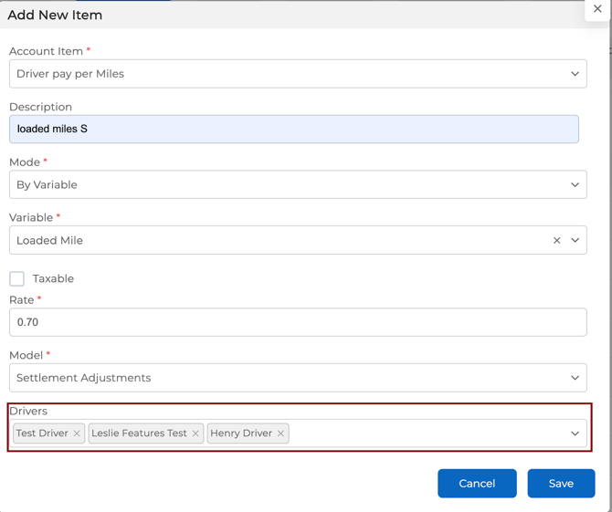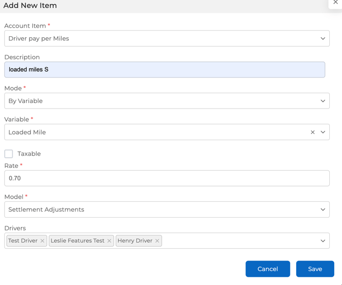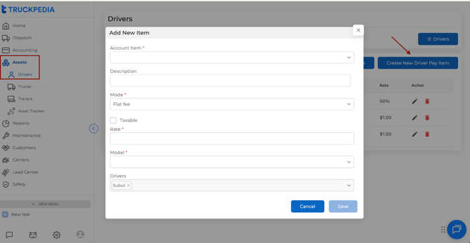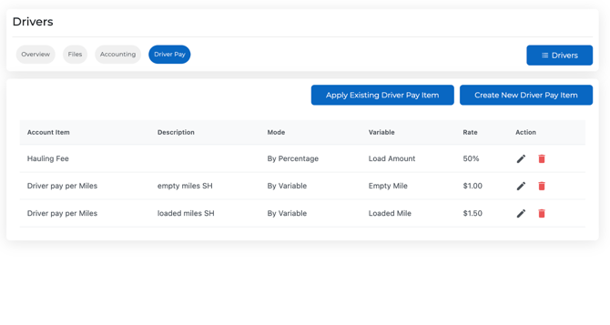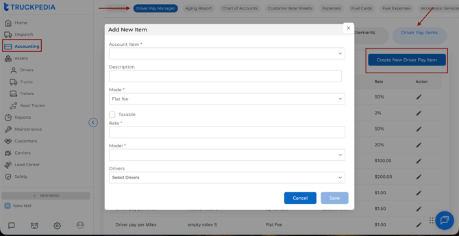 Accounting → Driver Pay Manager → Create new Driver Pay Items