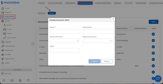 Before you can automate anything, you must create the Account Items that will appear in the “Account Item” dropdown when building driver pay rules.