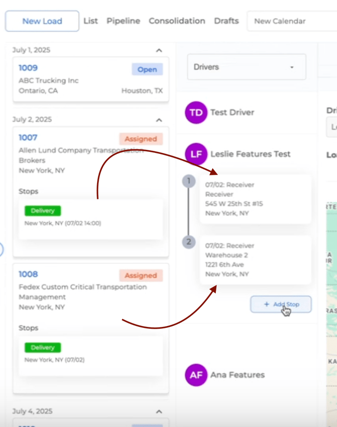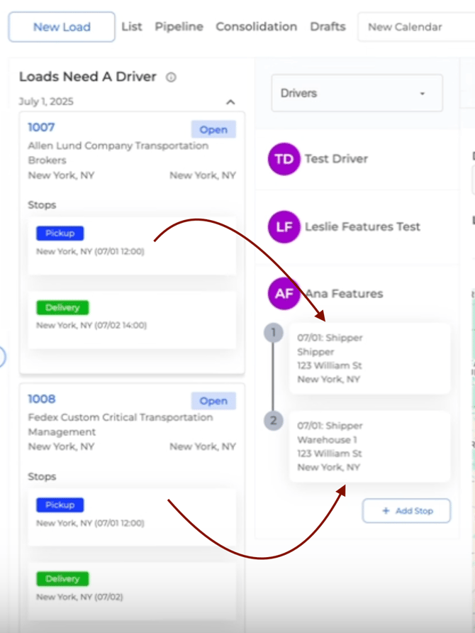 📌 Example: Drag the pickup stop for Load 1007 to Driver 1.