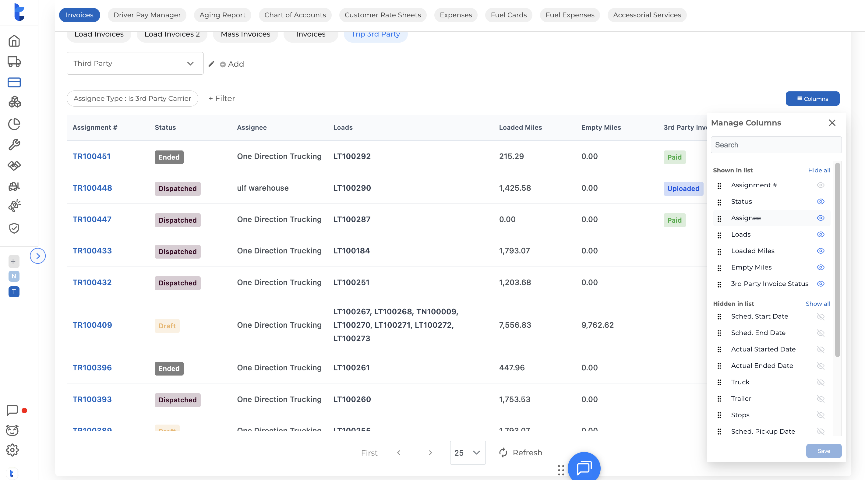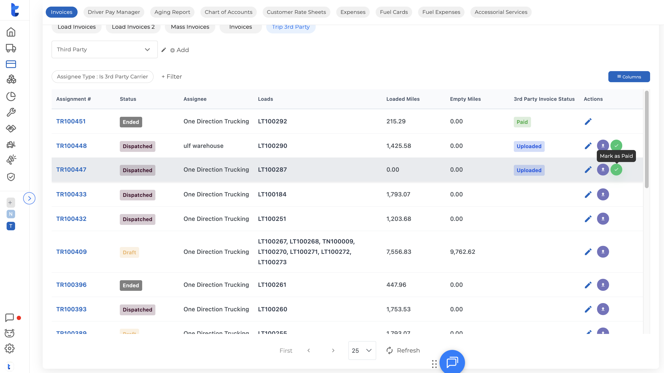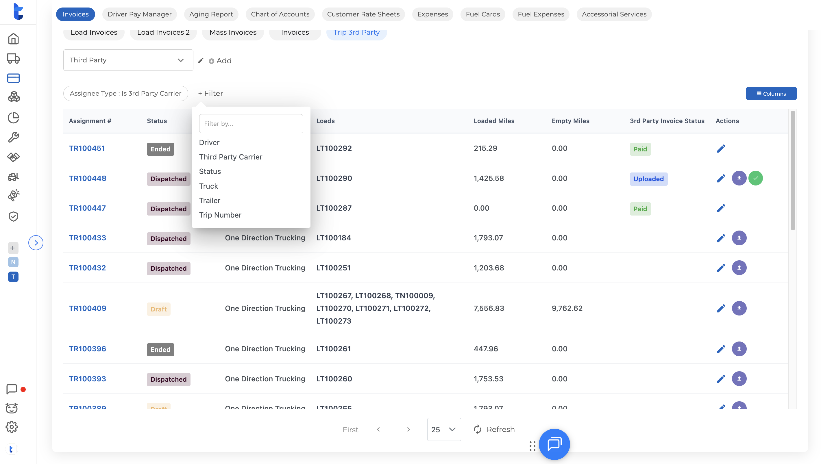 In the top tab bar, scroll to the right and click Trip 3rd Party. The list will automatically filter to show only assignments dispatched to a third-party carrier.